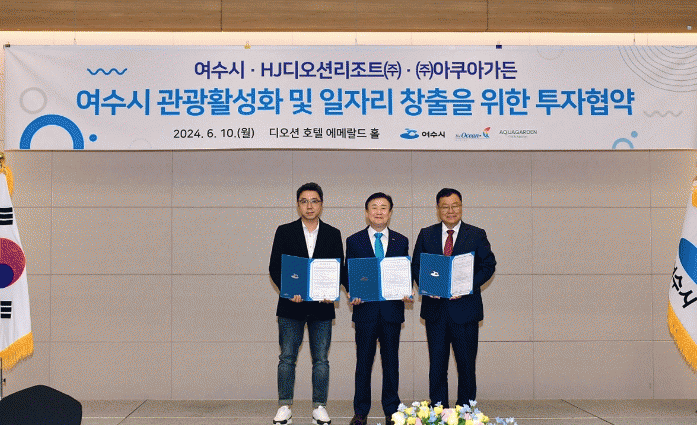 시에 따르면 지난 10일 디오션 호텔에서 HJ디오션리조트㈜, ㈜아쿠아가든과 연면적 1,500평, 3층 규모의 아쿠아가든 조성사업을 위한 투자 협약을 체결했다.