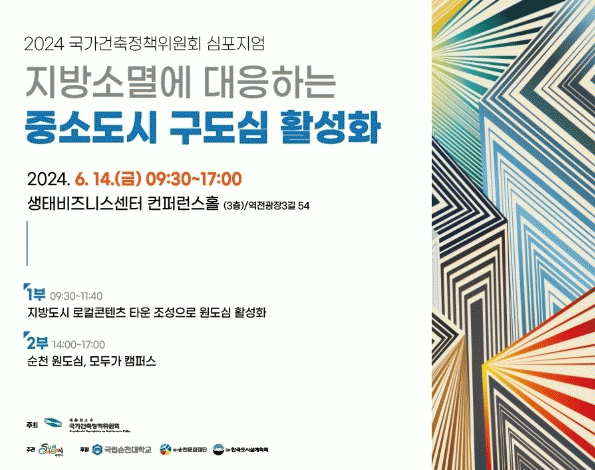 1부에서는 순천시 구도심 활성화를 위해 “지방도시 로컬 콘텐츠 타운 조성으로 구도심 활성화”라는 주제로, 2부에서는 “지방소멸에 대응하는 중소도시 구도심 활성화”라는 주제로 진행된다.