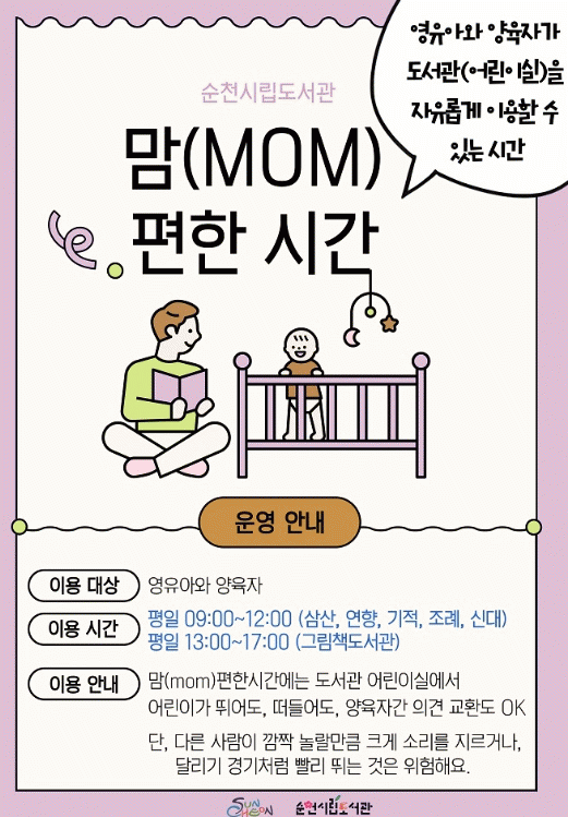 시 관계자는 “순천시는 어린이를 위한 제1호 기적의도서관이 있는 도시로, 기존 북스타트 사업 운영 등 도서관에서 영·유아를 위한 정책을 꾸준히 시행하고 있다”며, “‘맘(mom)편한 시간’을 통해 영유아와 양육자들이 눈치 보지 않고 도서관을 자유롭게 이용하길 바란다”고 밝혔다.