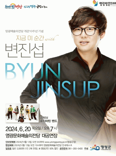 이번 ‘지금 이순간 with 변진섭’은 아름다운 가사말과 애절한 멜로디, 시공을 초월한 발라드의 황제 변진섭의 노래 이야기로 영광군민과 함께 개관10주년을 기념하며 감동의 무대를 선사한다. ‘너에게로 또 다시’, ‘희망사항’, ‘숙녀에게’등 주옥같은 히트곡을 멋진 라이브로 함께 할 예정이다.