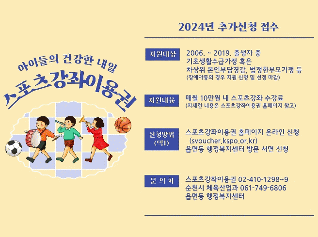 자세한 사항은 스포츠강좌이용권 이용 상담 및 순천시 체육산업과를 통해 문의하면 된다.