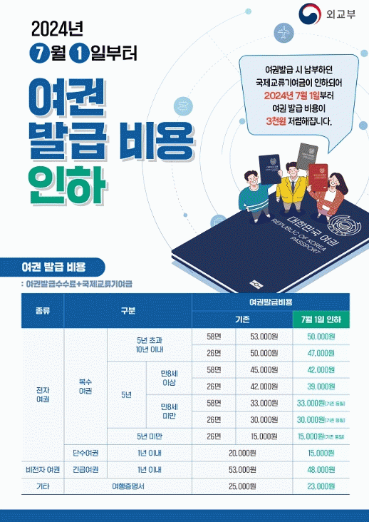 수수료에 포함된 국제교류기여금이 3천원 인하됨에 따라 10년 복수여권은 ▲58면 기준 5만원 ▲26면 기준 4만 7000원으로 변경된다.