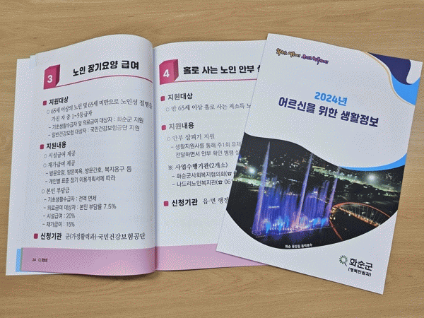책자를 받아본 어르신은 “글씨도 크고, 노인 장기요양 보험, 치매 조기 검진 등 꼭 알아야 하는 사업들에 대해 안내하고 있어 도움이 된다.”라며, “'화순 꽃강길 음악분수'와'화순 사평빨래방'을 표지에 담아 더욱 좋았다.”라고 고마움을 표했다.