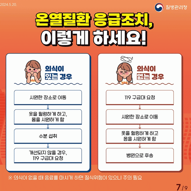 온열질환자가 발생했을 때 의식이 있다면 시원한 장소로 이동하여 옷을 헐렁하게 하고 몸을 시원하게 하여 수분을 섭취해야 한다.