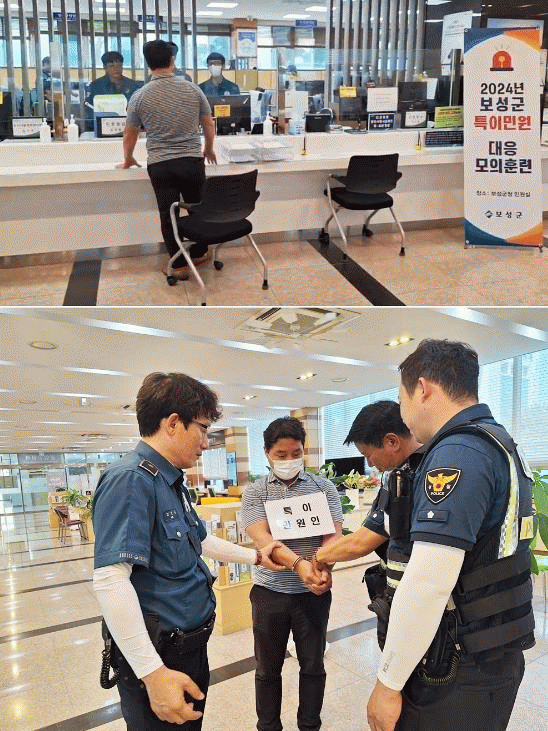 이번 훈련은 폭언.폭행 등 민원실 내 특이민원에 대비하고 비상 상황 발생 시 대응능력을 향상하고자 민원 담당 공무원들의 역할을 사전에 부여해 보성경찰서와 합동으로 진행했다.