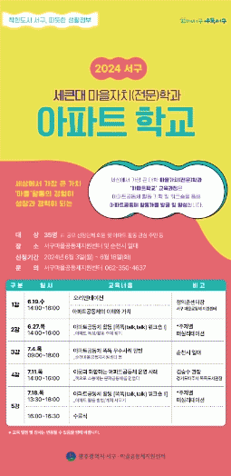 정의춘 서구 마을공동체지원센터장은 “이번 교육을 통해 아파트공동체 이해·가치를 확립하고 새로운 공동체를 발굴하겠다”며 “앞으로도 착한도시 서구 속 사람꽃이 피는 아파트공동체 조성을 위해 힘써나가겠다”고 말했다.