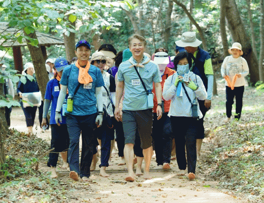 [뉴스맘]김이강 광주 서구청장은 15일 오전 맨발걷기 주민동호회 회원들과 함께 서구 매월동 '백마산 맨발로'를 걸으며 소통시간을 가졌다.