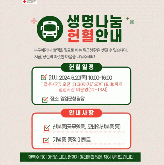 영암군보건소 관계자는 “지역공동체의 안녕을 위해 구성원이 할 수 있는 가장 쉬운 참여가 헌혈이다. 이웃을 포함한 타인의 생명을 살리는 헌혈에 많은 영암군민이 동참해주길 바란다”고 전했다.