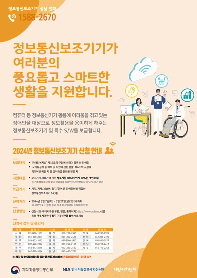 장애인이 정보통신 기술에 쉽게 접근하도록 특수 보조기기를 저렴하게 보급하는 정보통신보조기기 보급사업은 현재 접수를 진행하고 있다. 정보통신보조기기 온라인 신청 누리집이나 시군 정보화업무 담당부서에 방문하거나 전자우편으로 오는 21일까지 신청하면 된다.