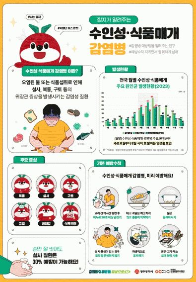 수인성·식품매개 감염병 중 주로 발생하는 장관감염증(살모넬라, 캄필로박터, 장병원성대장균)의 2023년 광주지역 발생 현황을 보면 총 493건이 신고됐고, 이 중 239건(48%)은 주로 6~8월에 집중되는 경향을 보였다.