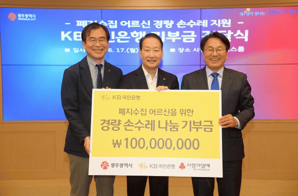 서영익 KB국민은행 부행장은 “이번 경량 손수레 기부금 전달로 폐지 수집 어르신들에게 힘이 되길 바란다”며 “KB국민은행은 광주시의 역점 사업에 힘을 보태고, 금융동반자로서 역할을 다해 나가겠다”고 밝혔다.