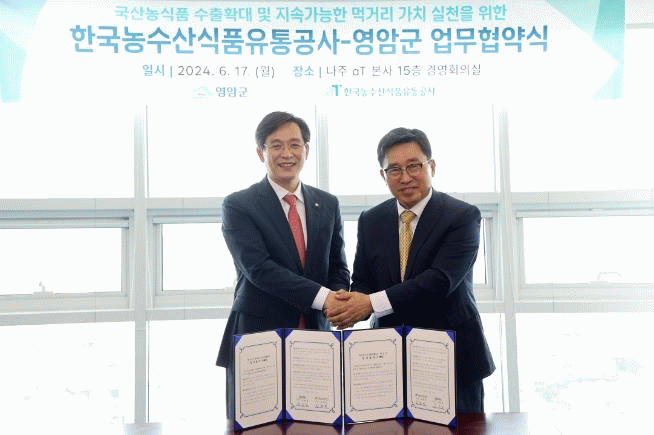 이날 협약으로 영암군과 한국농수산식품유통공사는 ▶저탄소 식생활 캠페인 동참 농식품 분야 탄소중립 실천 ▶농식품 수출확대 및 산업발전 인력·기술·정보교류 ▶농수산식품 수급안정·유통구조개선·소비촉진 등에 나선다.