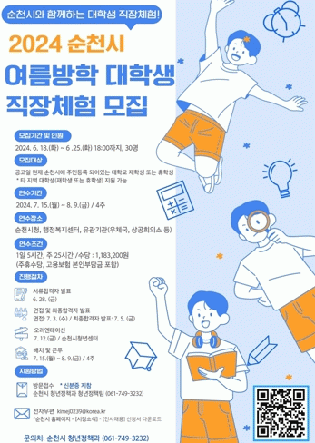 서류전형과 면접전형을 거쳐 최종 선발된 연수생은 7월 15일부터 8월 9일까지 4주 동안 순천시청, 행정복지센터 등에 배치되어, 행정 사무 보조, 민원 안내 등 직장 체험을 하게 된다.