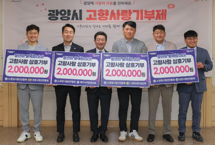 참여한 단체는 광양시청년연합회를 포함해 포항향토청년회, 제주시연합청년회, 영천시청년연합회, 순천시청년연합회 총 5개 단체로, 각 단체는 상호기부 제안에 고향사랑의 뜻을 모아 기쁜 마음으로 참여했다고 알렸다.