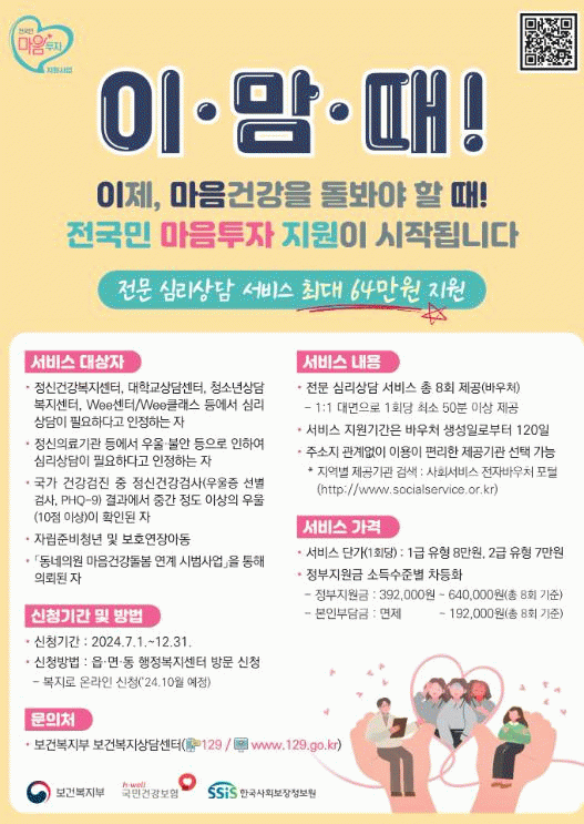 전국민 마음투자 지원사업은 정부가 지난해 12월 발표한 정신건강정책 혁신방안의 핵심과제로 경증 정신질환이 중증 정신질환으로 악화하거나 자살로 이어지지 않도록 일상적 마음 돌봄 체계를 구축하기 위해 추진되는 사업이다.