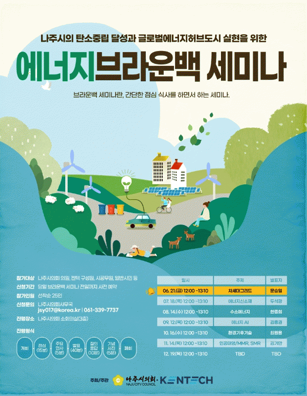e-브라운 백 세미나는 나주시의 탄소중립 달성과 글로벌에너지허브도시 실현을 위한 에너지 관련 지식과 산업동향 정보 습득 및 정책 과제 발굴을 목적으로 기후위기 대응 탄소중립 실현 연구회 시즌Ⅱ와 국내 에너지 특화 대학인 한국에너지공과대학교(KENTECH)가 공동으로 주최한다.