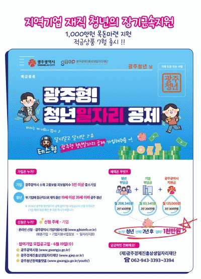 이 사업은 지역 중소기업 재직 청년에게 재정 지원을 통해 장기 근속과 지역 정착을 유도하고, 미취업 청년의 지역 중소기업 유입 촉진을 위해 도입됐다. 중소기업 재직 청년이 2년 간 500만원을 모으면 기업(200만원)과 광주시(300만원)가 500만원을 추가 적립해 만기공제금 1000만원을 만들어주는 사업이다.