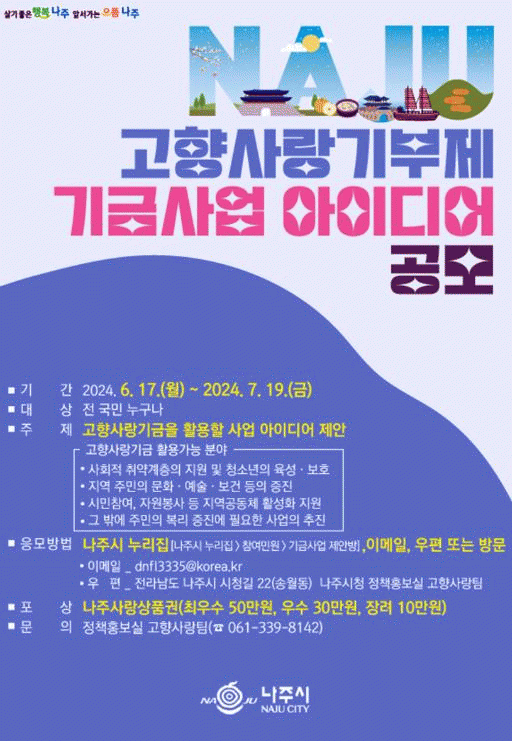 나주시는 오는 7월 19일까지 한 달간 전 국민을 대상으로 나주고향사랑기부제 기금사업 아이디어를 공모한다고 19일 밝혔다.