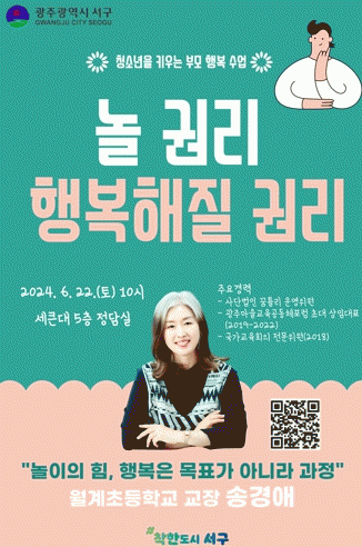 서구는 오는 22일 세큰대(서구 경열로 28) 5층 정담실에서 월계초등학교 교장이자 (사)꿈틀리 운영위원인 송경애 강사를 초청해 ‘놀 권리, 행복해질 권리’를 주제로 교육을 진행한다.