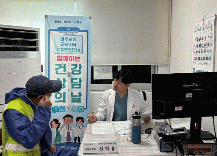 이날 여수시청 산업보건의로 위촉된 여수전남병원 직업환경의학과 ‘신덕용 과장’은 근로자의 특수건강진단 결과표와 개별 문진표를 기반으로 건강상담을 진행하고 근로자의 연령대가 높은 만큼 심혈관계·근골격계질환 예방법에 관한 교육도 실시했다.
