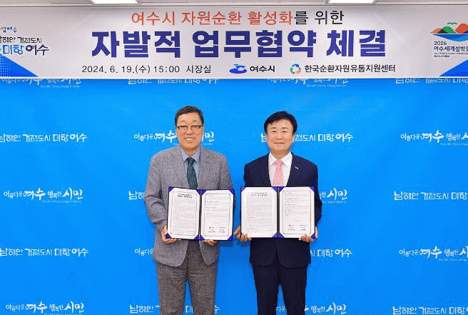 특히 여수시는 생산자책임재활용제도(EPR)의 중추기관인 KORA로부터 고품질의 재활용 자원 회수·선별지원을 받게 돼 안정적인 자원순환체계 구축에 탄력을 받을 것으로 기대하고 있다.