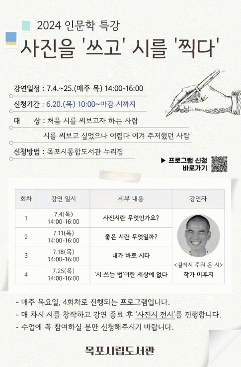 '사진을 쓰고 시를 찍다'는 매 회차 다양한 시를 접해보고, 제시된 주제에 맞는 시를 창작하는 수업으로 4회차 강연이 끝나면 수강생들의 시를 도서관 복합문화공간에 전시할 예정이다.