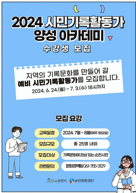 이번 양성 과정은 기록문화에 관심 있는 순천 시민을 대상으로 25명 내외로 선발하여 7월 9일부터 매주 화요일에 진행할 예정이다.