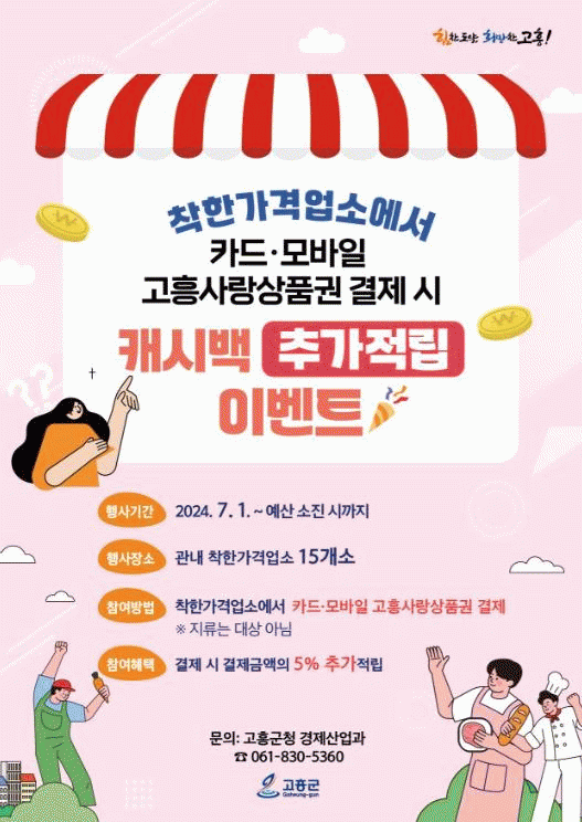 군은 지속되는 고물가·고금리 상황을 극복하고 지역경제를 활성화하기 위해 오는 7월 1일부터 예산 소진 시까지 관내 착한가격업소에서 고흥사랑카드·모바일 고흥사랑상품권 결제 시 5% 추가 캐시백 혜택을 제공한다.