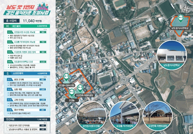 이번에 선정된 강진군의 ‘남도 맛 1번지 음식타운 조성’ 사업은 강진읍 시장 및 오감통 일원에 총사업비 110억 원(국비 50억 원)을 투입해 남도음식사관학교 조성, 시장수산동과 먹거리장터 리뉴얼, 오감만족 이벤트 광장 정비 등을 통해 외식업 특성화 공간을 조성할 계획이다.