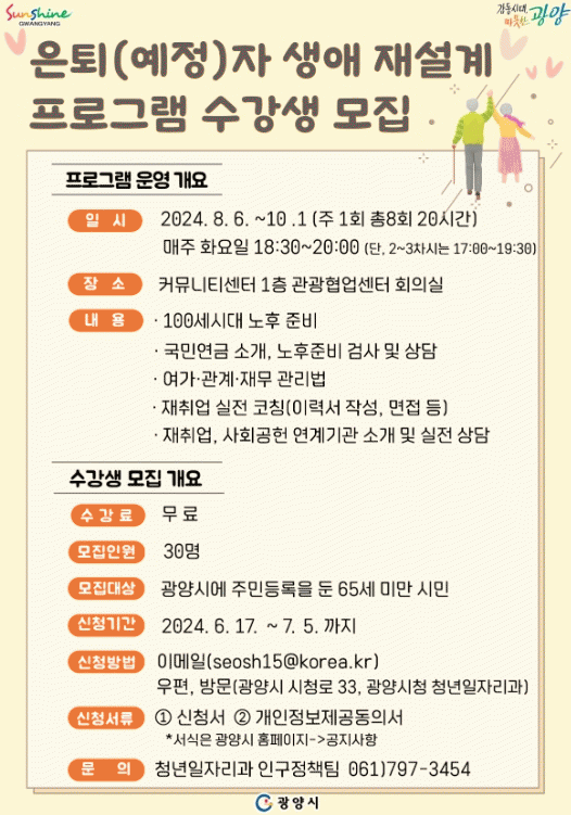 신청일 기준 광양시에 주민등록을 둔 시민을 대상으로 30명을 모집하며 46세에서 64세 를 우선 선정하고 이후 46세 미만을 선정할 예정이다.