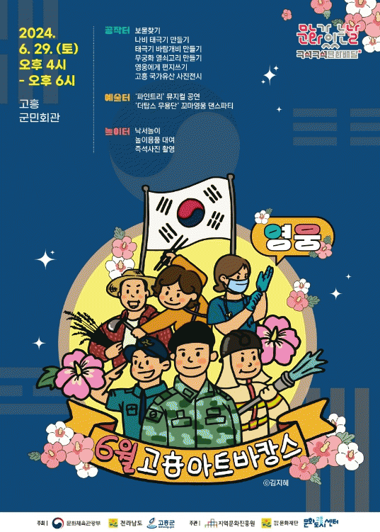 지난 6월 1일 ‘봄소풍’을 컨셉으로 군민들의 눈과 귀를 즐겁게 했다면 이번 6월 29일 고흥군민회관에서 펼쳐질 두 번째 고흥아트바캉스는 ‘영웅’을 주제로 나라 사랑을 실천하기 위한 다양한 프로그램을 운영해 감동을 주고 군민들의 가슴을 뜨겁게 할 전망이다.