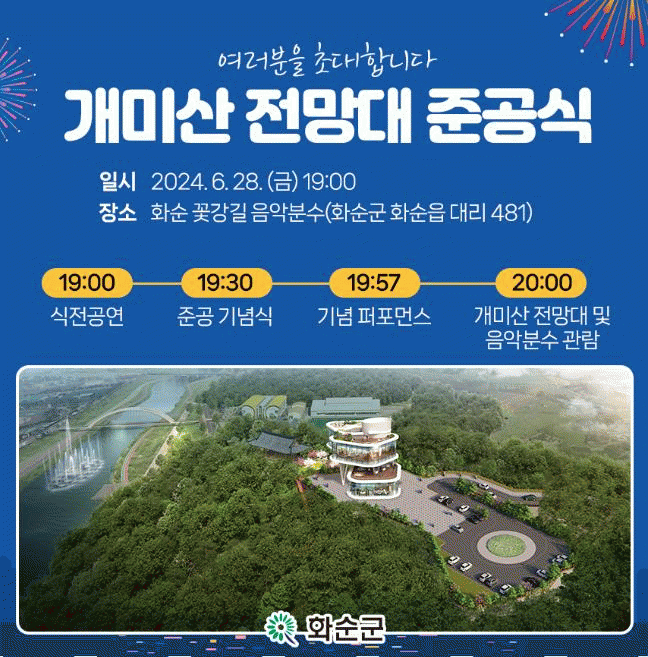 준공식은 민선 8기 2주년을 기념하여 지역주민, 관광객에게 화순군의 아름다운 경관과 화순천 음악분수대 공연 등 다양한 볼거리를 제공하기 위한 차원에서 마련됐다.