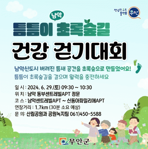 이번 행사는 남악 기후 대응 도시숲 조성사업 준공을 기념하여 개최되며 남악 틈새 공간에 조성된 초록숲을 걷고 건강을 위하여 일상 속 틈틈이 걷는 시간을 갖고자 추진됐다.
