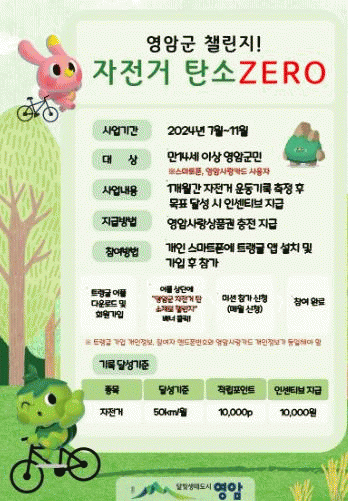 영암군 관계자는 “이번 사업은 영암군민의 건강을 증진하고, 지역경제 활성화, 탄소중립 생활 실천까지 엿볼 수 있는 일석삼조 챌린지다. 영암군민의 많은 관심과 참여 바란다”고 전했다.