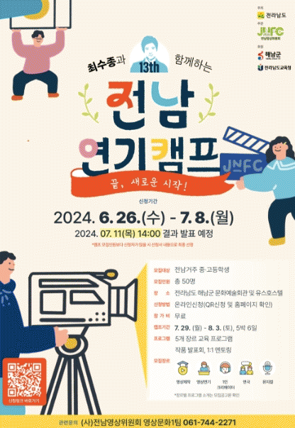 김성원 전남도 문화산업과장은 “엔터테이너를 꿈꾸는 도내 청소년들에게 ‘전남연기캠프’가 진로 발굴의 새로운 창구가 될 수 있을 것”이라며 “전남도 청소년들에게 창의력과 사회성을 키우는 배움과 성장의 좋은 기회로, 많은 관심과 참여를 부탁한다”고 말했다.