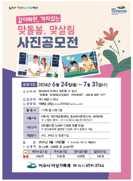 올해로 6회째를 맞이한 공모전은 일상에서 누구나 실천할 수 있는 공동육아와 가사분담 내용이 담긴 사진을 통해 아이낳고 키우기 좋은 여성친화도시 여수 조성을 위해 기획됐다.