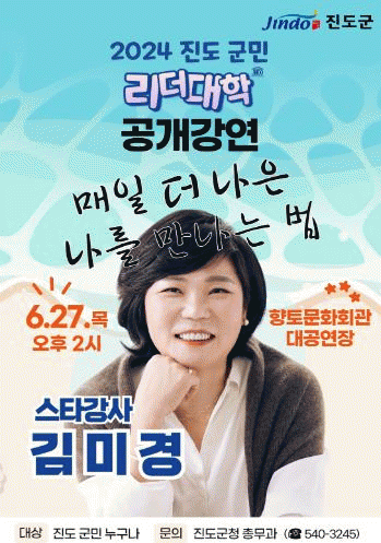 진도군 관계자는 “이번 공개강연을 통해 리더대학 입학생 뿐만 아닌 다른 군민들에게도 자기계발의 기회와 소양을 쌓을 수 있는 기회가 되도록 최선을 다하겠다”고 말했다.