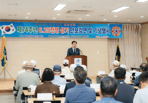 영광군 재향군인회 주관으로 진행된 이번 행사에는 김정섭 영광군수 권한대행과 강필구 군의회 의장을 비롯한 6.25 참전유공자 및 보훈 가족 등 150여 명이 참석했으며, ‘북핵문제와 한반도 평화’라는 주제의 안보 강연에 이어 유공자 표창, 대회사, 기념사, 결의문 낭독, 6.25노래 제창 순으로 진행됐다.