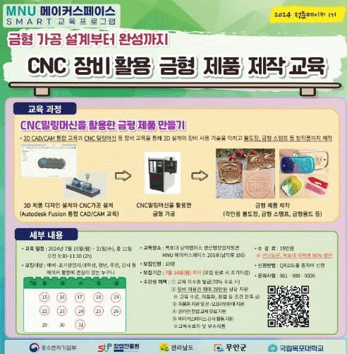 해당 과정은 오는 7월 14일까지 MNU 메이커스페이스 홈페이지 또는 신청 QR코드 등을 통해 메이커 활동에 관심이 있는 누구나 신청할 수 있으며, 전남도민 또는 목포대학교 재학생은 수강료를 50% 할인받을 수 있다.
