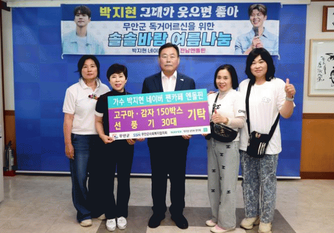 나민희 무안군 사회복지협의회장은 “고향의 어려운 이웃들을 위해 따뜻한 마음으로 기부해준 전남 엔돌핀 팬 여러분 모두에게 감사하다”며 “박지현의 신곡이 대박 나기를 기원함과 동시에 소중한 기부가 선한 나눔문화 확산에 영향력을 끼쳤으면 한다”고 말했다.