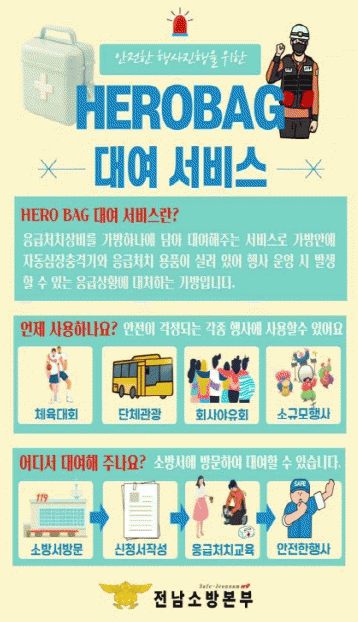 ‘HERO BAG 대여 서비스’는 행사를 주최하는 단체 및 기관에서 응급처치 장비 대여로 자체 안전확보 및 행사장에서 발생할 수 있는 응급상황에 신속하게 대응하기 위해 운영한다.