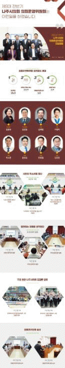 그 중, 제244회 임시회에 회부되어 제9대 의회 개원 이후 의회운영위원회 첫 조례로 상정되어 처리된 '나주시의회 토론회 등 운영에 관한 조례'는 시민과 함께하는 의회 구현에 한발짝 다가섰다는 점에서 의미가 깊다.