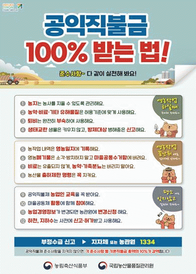 직불금을 100% 받기 위해서는 농가가 법령에서 정한 17가지 의무 준수사항을 모두 실천해야 한다.