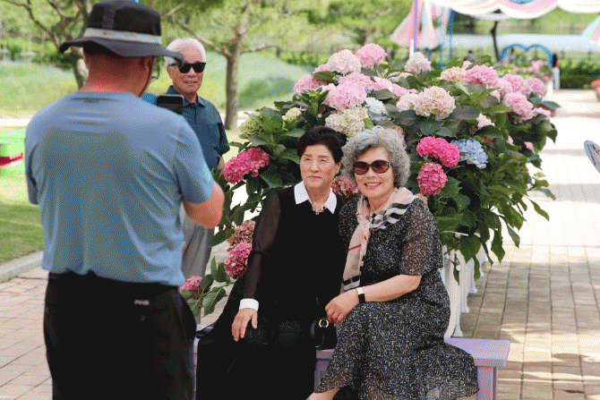 축제장을 찾은 관광객들이 저마다 휴대폰으로 사진찍기에 여념이 없다. 내가 예쁠까. 수국이 예쁠까. 신랑들은 말없이 미소만 지었다.