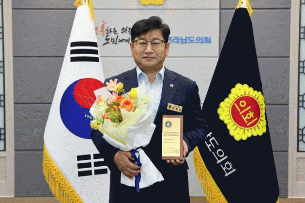 최정훈 전남도의원(더불어민주당, 목포4)이 전라남도의회에서 수상패를 받고 기념촬영을 하고 있다.