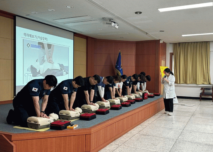 이날 교육은 응급상황에서 ▲의식확인 요령 ▲119 신고요령 ▲올바른 심폐소생술 자세와 방법 ▲심폐소생술 실습 ▲자동심장충격기(AED) 사용방법 등 실습 위주로 진행, 경찰공무원들의 현장 대응 시 응급상황 대처 능력 향상에 주안점을 뒀다.