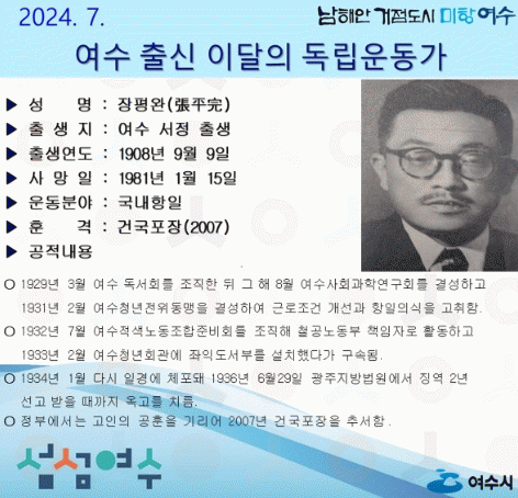 ‘장평완(張平完)선생’은 1929년 3월 여수 독서회를 조직한 뒤 그 해 8월 여수사회과학연구회를 결성하고, 1931년 2월 여수청년전위동맹 결성 후 근로조건 개선과 항일의식 고취에 힘썼다.