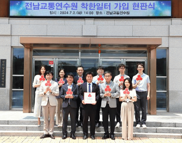 전남도교통연수원은 전남사회복지공동모금회와 함께 지난 2일 본관 현관에서 ‘착한일터’ 가입 현판식을 개최했다.