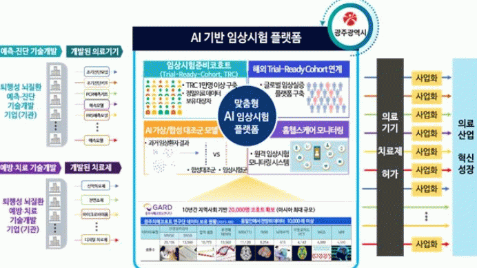 이에 광주시는 조선대학교 산학협력단(가드코호트연구단)이 구축한 약 2만명의 ‘아시아 최대 규모 지역기반 멀티 치매 코호트’를 활용해 ▲임상실증 맞춤형 대상자 선별 인공지능(AI)플랫폼 ▲원격 임상시험 모니터링 시스템 ▲인공지능(AI)기반 가상·합성 대조군 모델 등을 개발할 계획이다.
