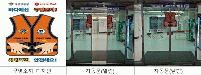 특히, 구명조끼 스티커는 ‘바다에선 구명조끼! 채워주면 안전해요!’의 문구와 함께 자동출입문이 닫히면서 구명조끼 벨트를 손으로 채우는 듯한 이미지를 연상시켜 시인성을 향상시켰다.